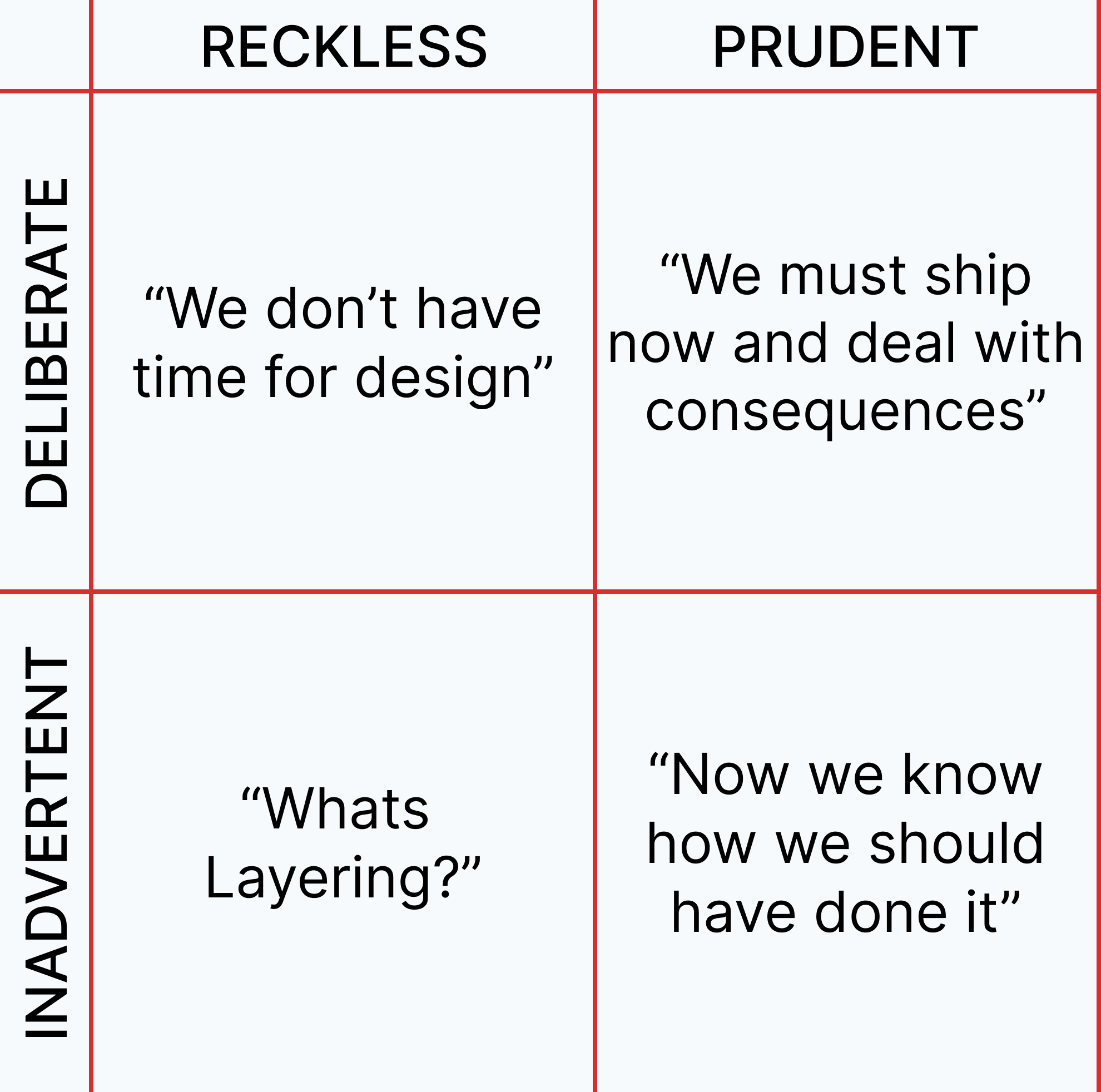 We are uncovering better ways of developing software by doing it and helping others do it. - Reckless & Unintentional - Team is ignoring design practices or clean code, usually because of the lack of experience, without even realizing how much problems it's getting into.