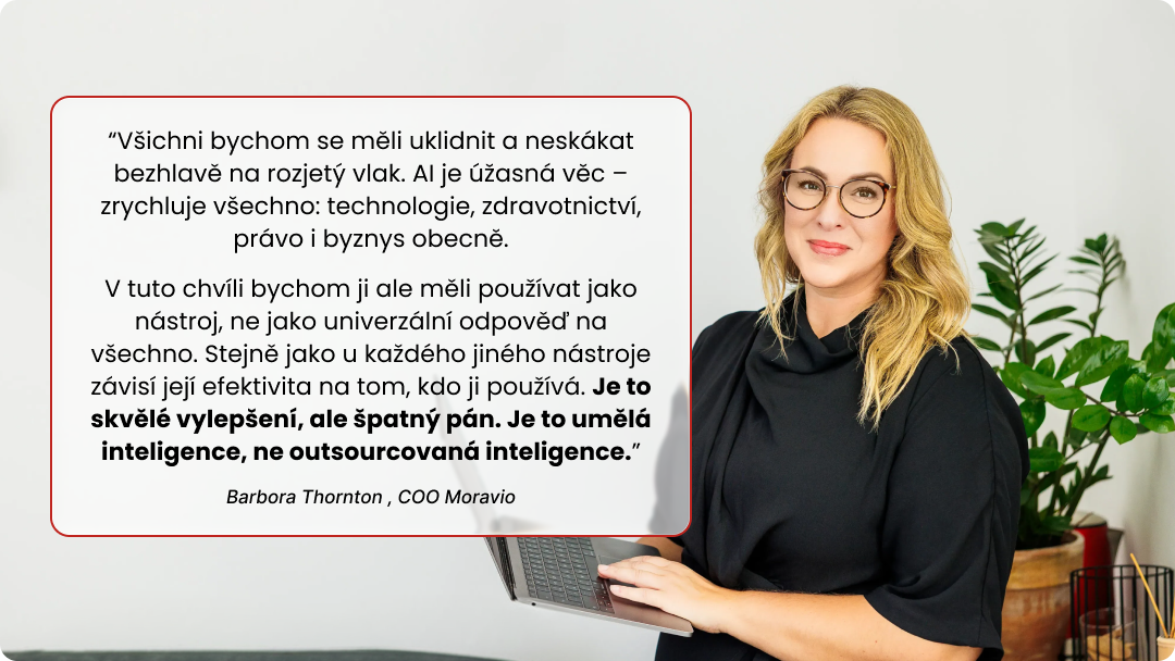 „Všichni bychom se měli uklidnit a neskákat bezhlavě na rozjetý vlak. AI je úžasná věc – zrychluje všechno: technologie, zdravotnictví, právo i byznys obecně. V tuto chvíli bychom ji ale měli používat jako nástroj, ne jako univerzální odpověď na všechno. Stejně jako u každého jiného nástroje závisí její efektivita na tom, kdo ji používá. Je to skvělé vylepšení, ale špatný pán. Je to umělá inteligence, ne outsourcovaná inteligence.“